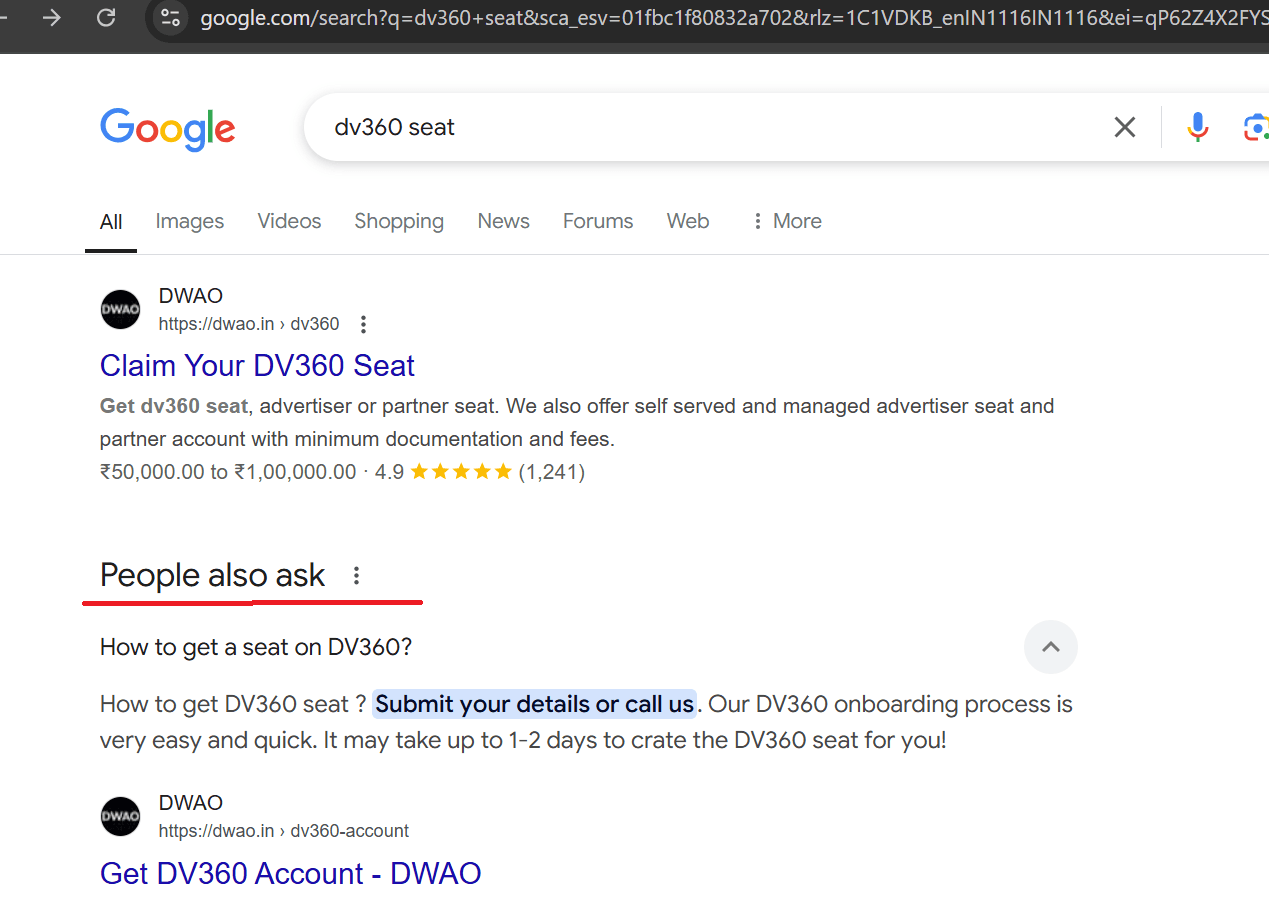 For example, search for DV360 seat in Gogole, you will notice “ People Also Ask” or “People also Search For” section which AI Generated. DWAO is on 1st position as natural ranking also DWAO is apearning under people also search for AI section. This is just an example of there are many other areas which help brands to be on top of search results.